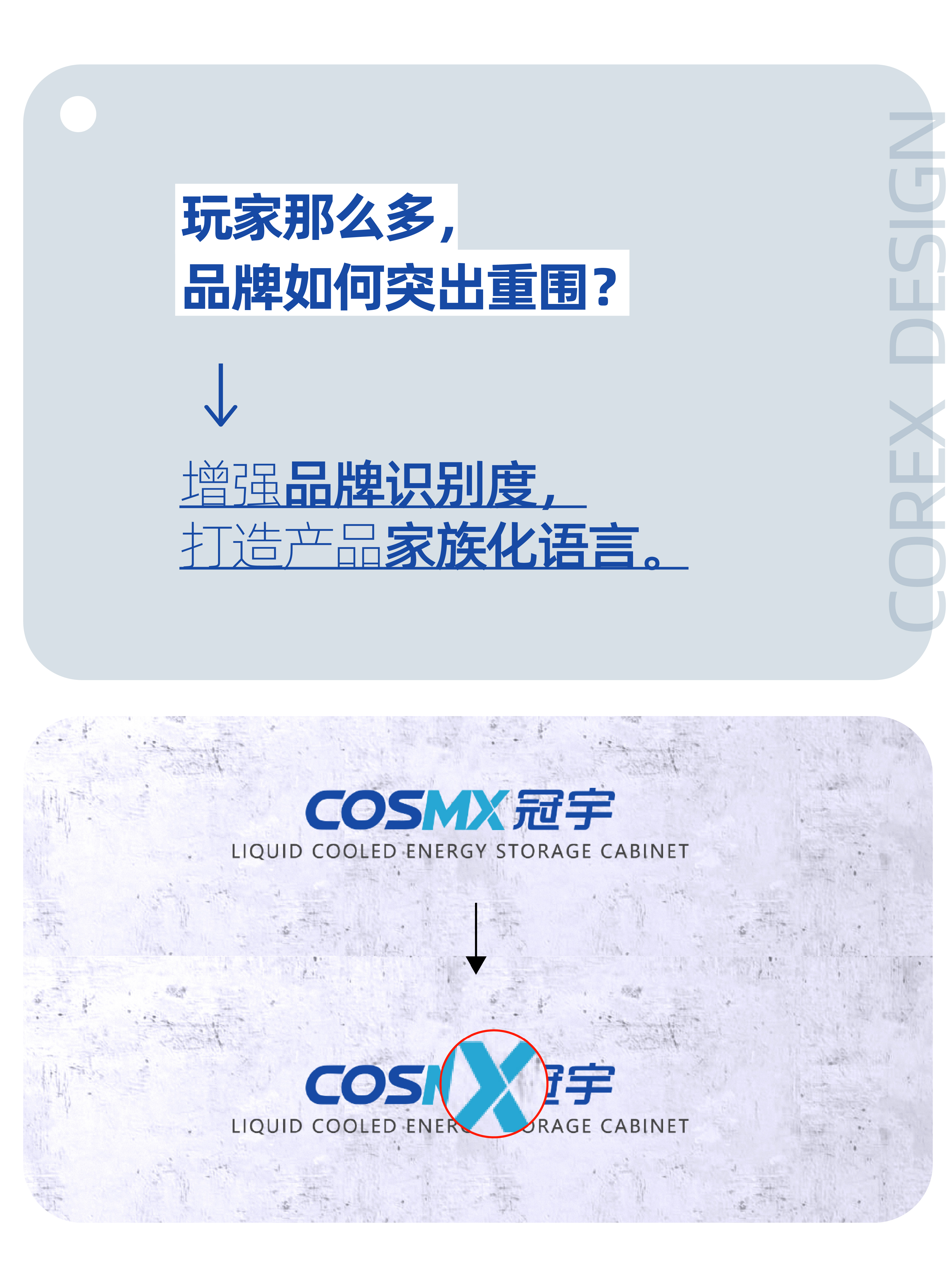 目前,工商业储能市场已经来到内卷的阶段。调研发现,市面上的储能柜多为集装箱式的造型,外观与颜色较为单一,不同品牌之间同质化严重,品牌不同产品之间没有固定的连续符号。于是,我们帮助冠宇定义旗下产品的设计符号,以液冷柜为起点,打造强识别家族化语言。