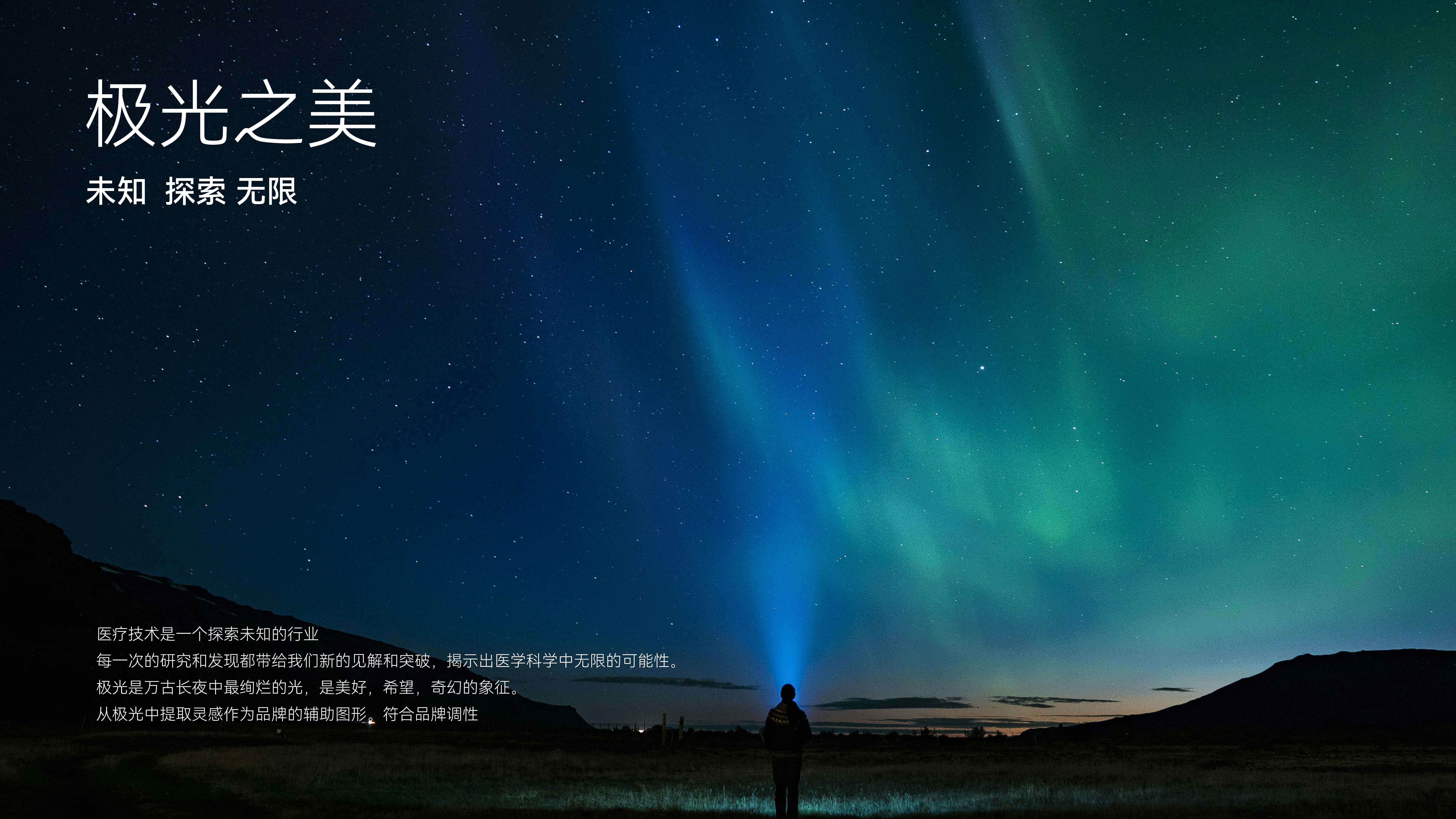 + 运用极光般的绚烂光影作为辅助图形,象征品牌在未知领域中不断探索与发现的精神,恰如医疗技术揭示科学中无限可能性的过程。