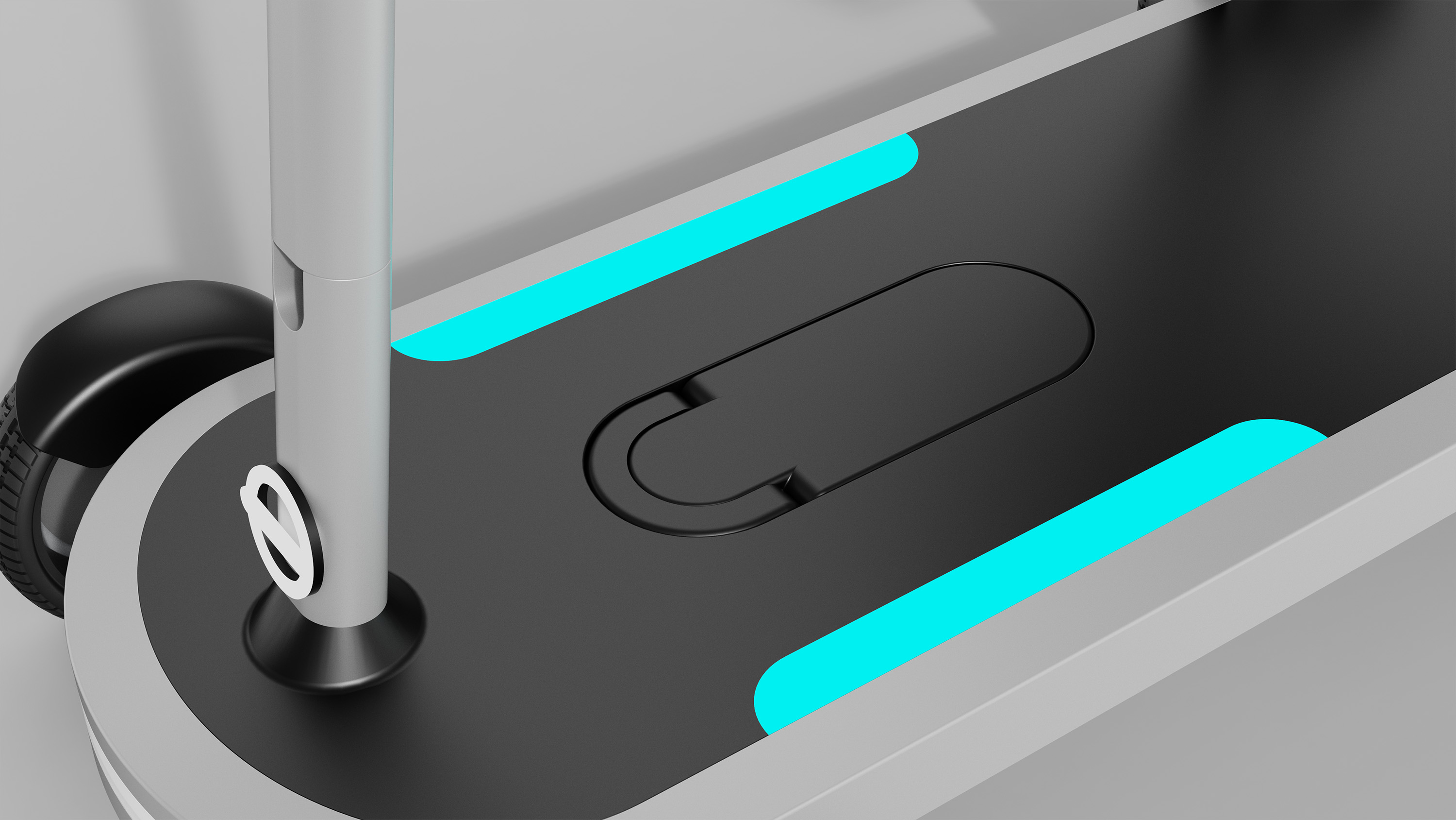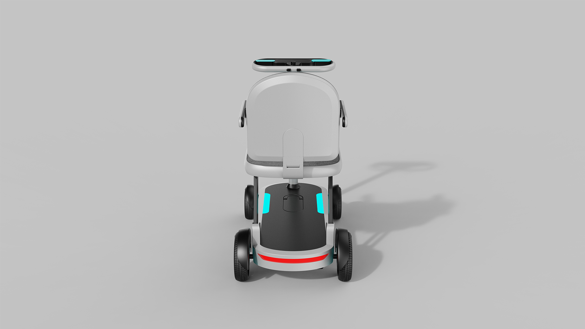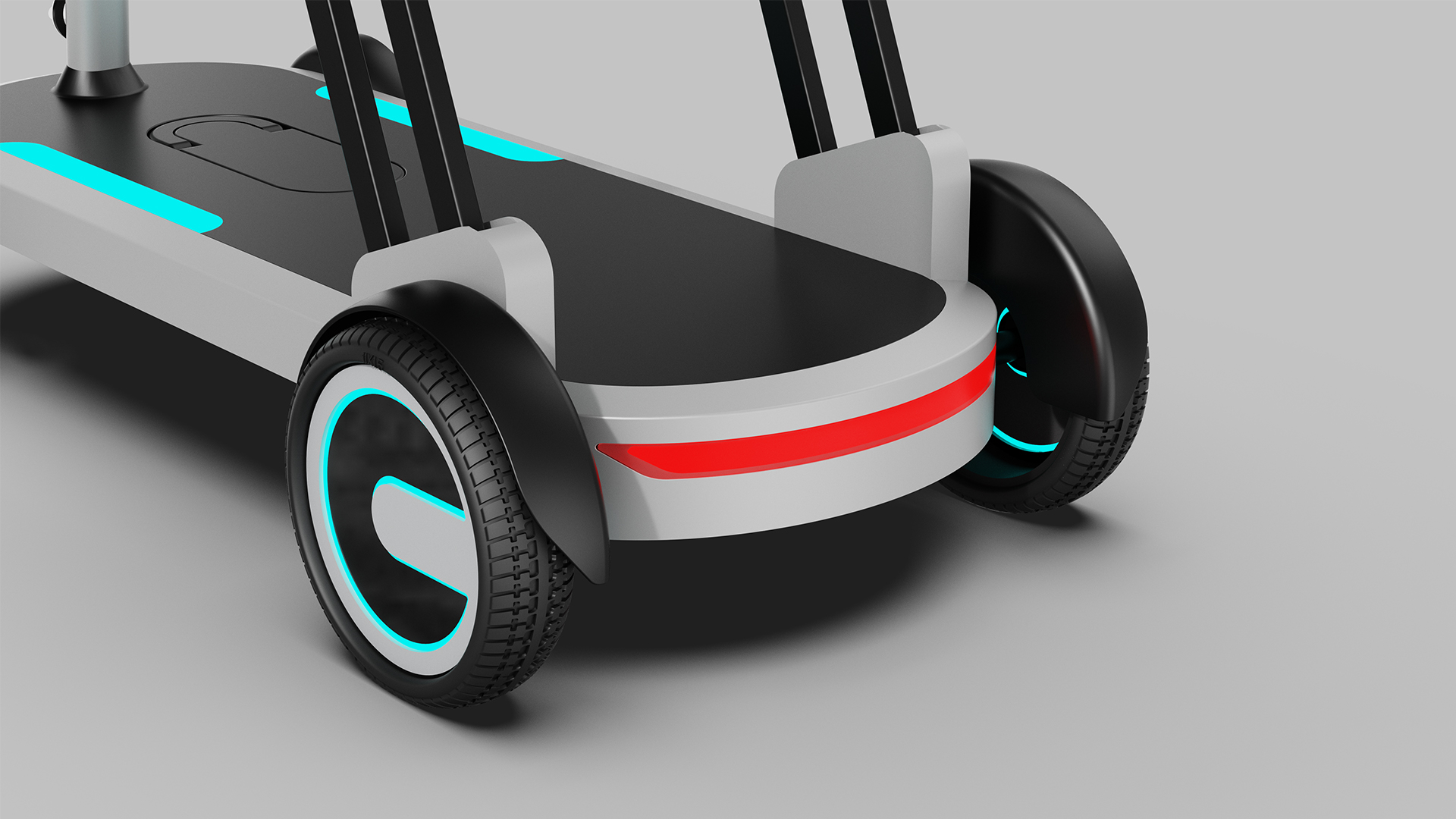 ⚫车头操作区为封闭式圆角矩形框架,握把保持一定倾斜角度,更贴近用户自然姿势;车轮侧面环形光圈设计与车身线条相呼应,形成统一的视觉识别。