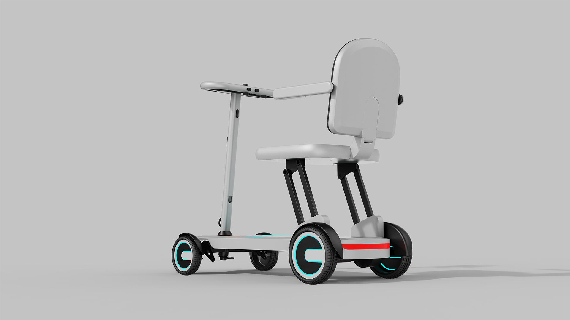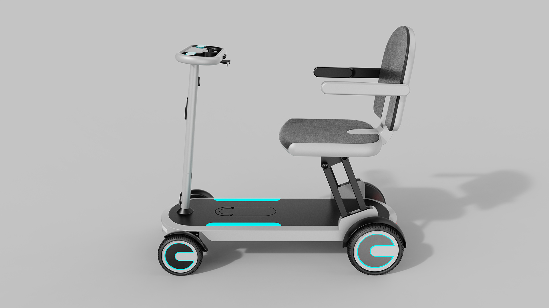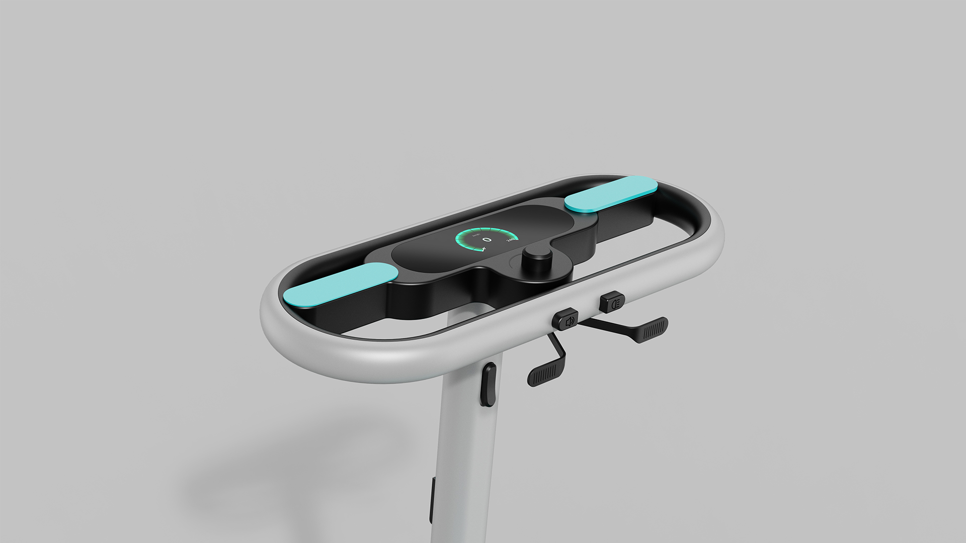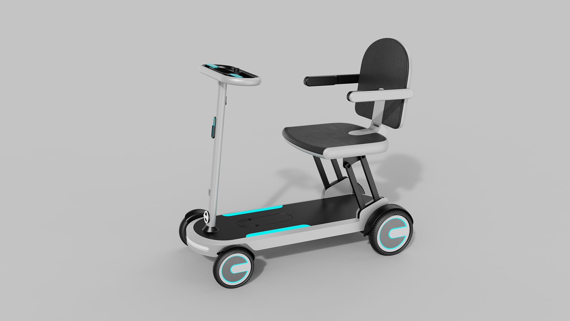 ⚫车头操作区为封闭式圆角矩形框架,握把保持一定倾斜角度,更贴近用户自然姿势;车轮侧面环形光圈设计与车身线条相呼应,形成统一的视觉识别。
