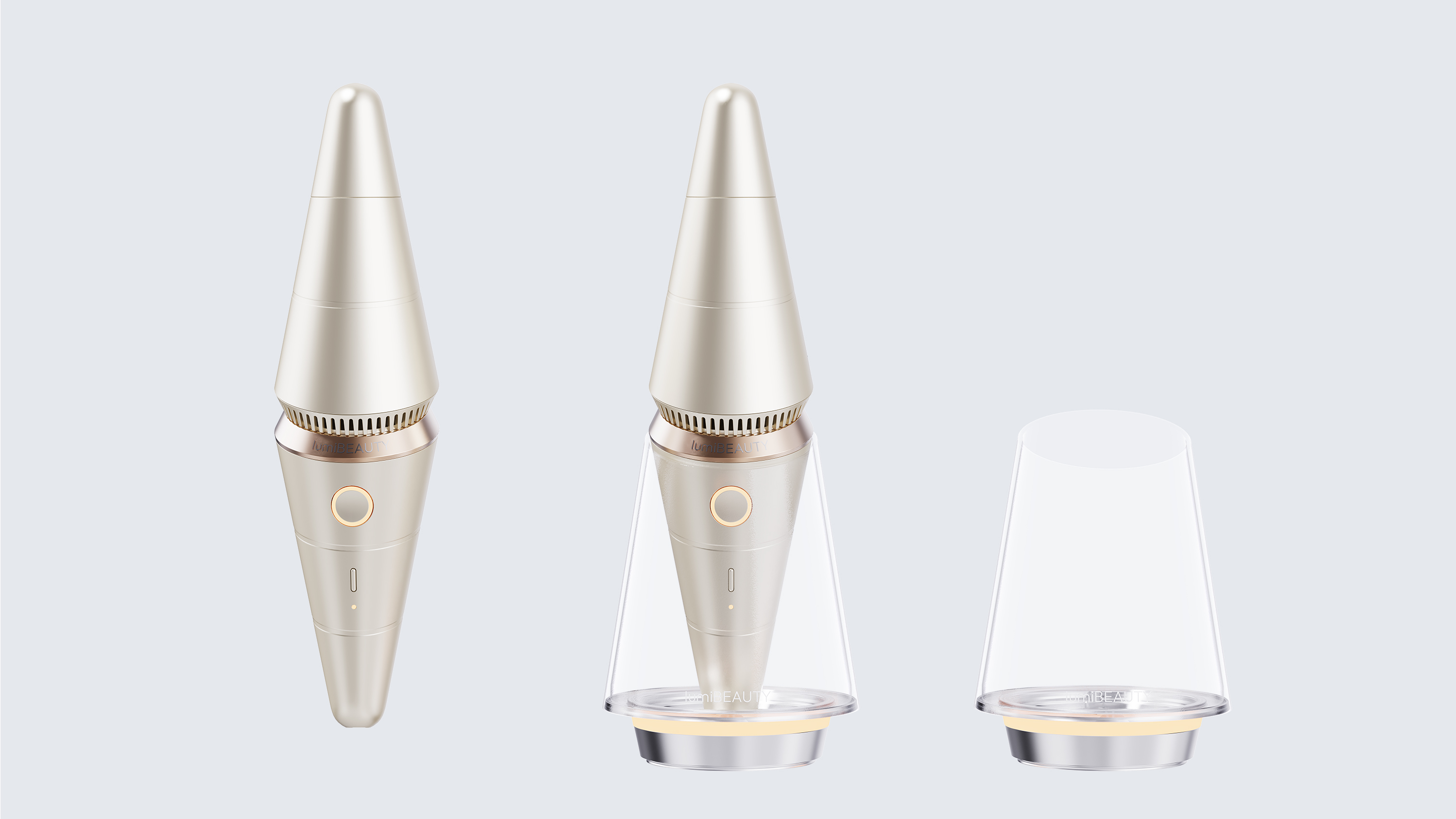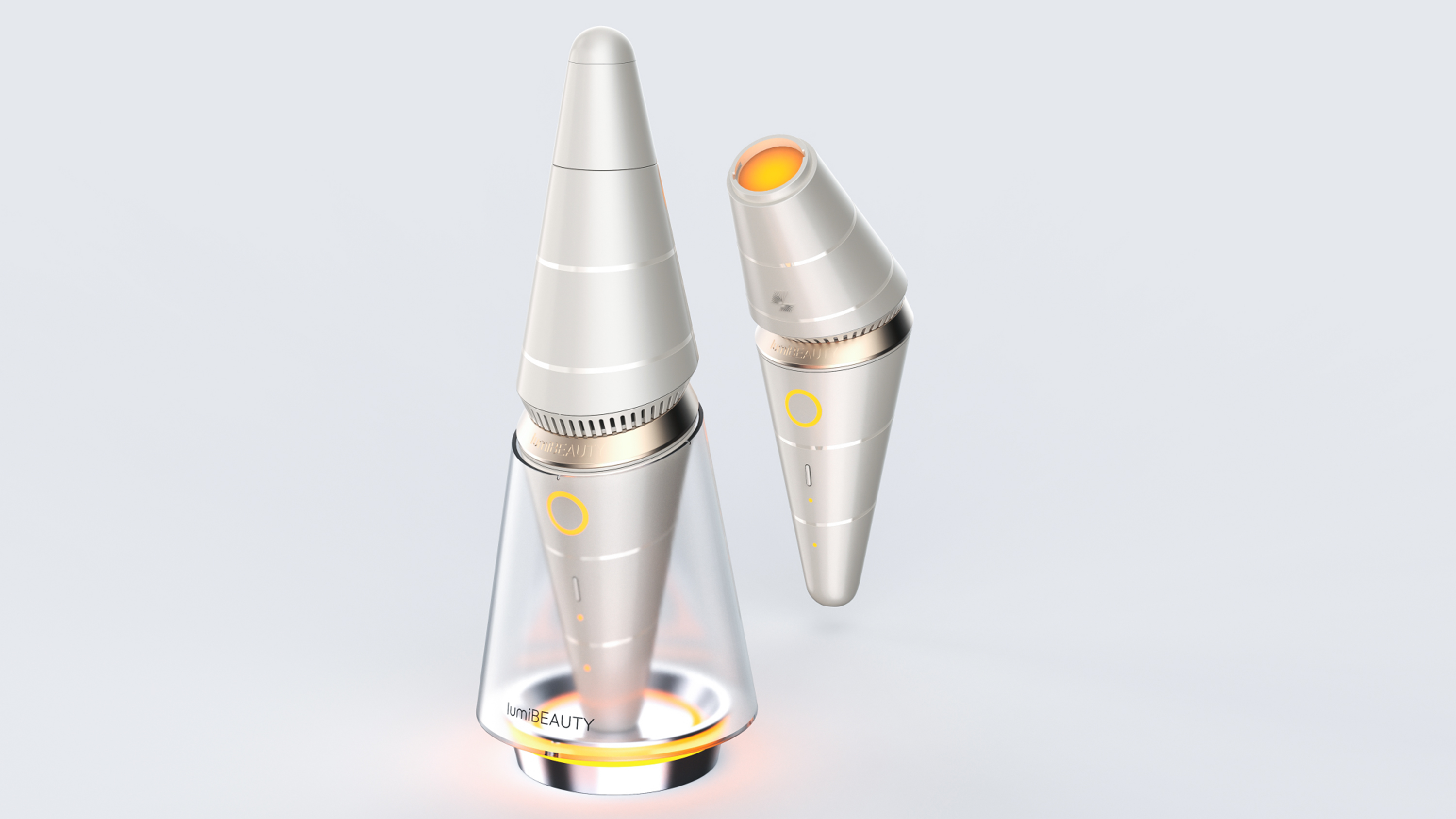 在高能量密度与体积受限的矛盾中,我们决定重新定义lumiBEAUTY美容仪“姿态”,——摒弃传统“手柄式”造型,以分段旋转的锥形结构,完成从开机到功能选择的全部操作。